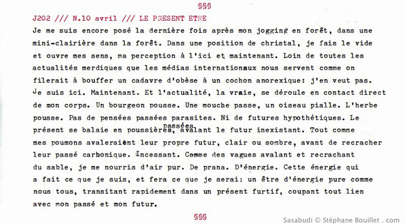 Je me suis encore posé la dernière fois après mon jogging en forêt, dans une mini-clairière entourée d'arbres. Au sol, dans une position christale, je fais le vide et ouvre mes sens, ma perception à l'ici et maintenant. Loin de toutes les actualités merdiques que les médias internationaux nous servent comme on filerait à bouffer un cadavre d'obèse à un cochon anorexique: j'en veut pas. Je suis ici. Maintenant. Et l'actualité, la vraie, se déroule en contact direct de mon corps. Un bourgeon grossit. Une mouche passe. Un oiseau piaille. L'herbe pousse. Pas de pensées passées parasites. Ni de futures hypothétiques. Le présent se balaie en poussières passées avalant le futur inexistant. Tout comme mes poumons avaleraient leur propre futur, clair ou sombre, avant de recracher leur passé carbonique. Incessant. Comme des vagues avalant et recrachant du sable, je me nourris d'air pur. De prana. D'énergie. Cette énergie qui a fait ce que je suis, et fera ce que je serai: un être d'énergie pure comme nous tous, transitant rapidement dans un présent furtif, coupant tout lien avec mon passé et mon futur.