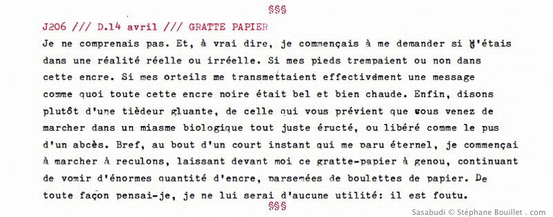 Je ne comprenais pas. Et, à vrai dire, je commençais à me demander si j'étais dans une réalité réelle ou irréelle. Si mes pieds trempaient ou non dans cette encre. Si mes orteils me transmettaient effectivèment une message comme quoi toute cette encre noirâtre était belle et bien chaude. Enfin, disons plutôt d'une tièdeur gluante, de celle qui vous prévient que vous venez de marcher dans un miasme biologique tout juste régurgité, ou libéré comme le pus d'un abcès. Bref, au bout d'un court instant qui me paru éternel, je commençai à marcher à reculons, laissant devant moi ce gratte-papier à genou, continuant de vomir d'énormes quantités d'encre, parsemées de boulettes de papier. De toute façon pensai-je, je ne lui serai d'aucune utilité: il est foutu.