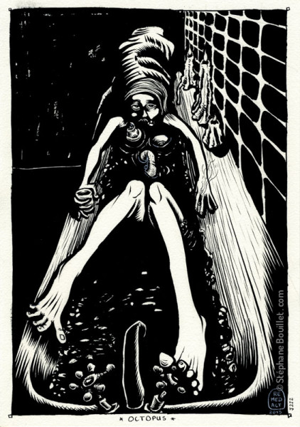 J'aimais bien me fumer un buz en prenant un bain. Très chaud. En général je commençais par mettre entièrement la tête sous l'eau, et rester là en apnée, ouvrant alors la porte de ce monde silencieux et délicieusement léger. Je refaisais surface quelques minutes, le temps de fumer un stick préparé à l'avance, et dont la fumée glissait dans ma gorge entre deux lapées d'Absinthe. J'adorais la teinte jaunâtre que prenait l'intérieur du bus quand mon cerveau commençais à se retourner, aidé en cela par les faibles lueurs des bougies. C'est en général à ce moment là qu'Octopus commençait à me masser, à m'aspirer et à rentrer en moi. Je sentais l'eau monter au fur et à mesure que je m'abandonnais à glisser suavement dans cet autre monde aquatique...