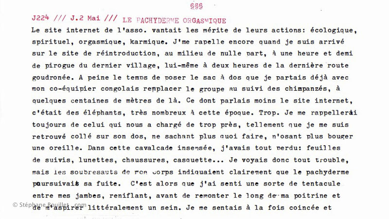 Le site internet de l'asso. vantait les mérites de leurs actions: écologiques, spirituelles, orgasmiques, karmiques. J'me rapelle encore quand je suis arrivée sur le site de réintroduction, au milieu de nulle part, à une heure et demi de pirogue du dernier village, lui-même à deux heures de la dernière route goudronée. À peine le temps de poser le sac à dos que je partais déjà avec mon co-équipier congolais remplacer le groupe au suivi des chimpanzés, à quelques centaines de mètres de là. Ce dont parlais moins le site internet, c'était des éléphants, très nombreux à cette époque. Trop. Je me rappellerai toujours de celui qui nous a chargé de trop près; tellement que je me suis retrouvée collée sur son dos, ne sachant plus quoi faire, n'osant plus bouger une oreille. Dans cette cavalcade insensée, j'avais tout perdu: feuilles de suivis, lunettes, chaussures, casquette... Je voyais donc tout trouble, mais les soubresauts de mon corps indiquaient clairement que le pachyderme poursuivais sa fuite. C'est alors que j'ai senti une sorte de tentacule entre mes jambes, reniflant, avant de remonter le long de ma poitrine et de m'aspirer littéralement un sein. Je me sentais à la fois coincée et remuée de manière cyclique par le pas lourd mais silencieux de ce mastodonte. J'ai du tombé dans les pommes, puisque ce sont mes derniers souvenirs, avant de me réveiller curieusement joyeuse et groggy dans mon nouvel univers, kaki trouble.