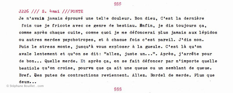Je n'avais jamais éprouvé une telle douleur. Bon dieu, C'est la dernière fois que je fricote avec ce genre de bestiau. Enfin, je dis toujours ça, comme après chaque cuite, comme quoi je me défoncerai plus jamais aux lépidos ou autres merdes psychotropes, et à chaque fois c'est pareil. J'dis non. Puis le stress monte, jusqu'à vous exploser à la gueule. C'est là qu'on avale lentement et qu'on se dit: "allez, juste un...". Après, j'arrête pour de bon... Quelle merde. Et après ça, on se fait défoncer par n'importe quelle bestiole qu'on croise, pourvu que ça ait une queue ou un semblant de queue. Bref. Ces putes de contractions reviennent. Allez. Bordel de merde. Plus que deux...