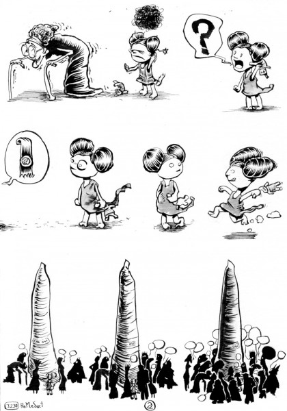 Il y a comme des énormes bruits de pétards, ou comme des bruits d'énormes pétards... Hein ? Oui, comme des canons. Je sais pas trop pourquoi. Mais voilà que j'entends des clairons... une fanfare. Et des gens qui se précipitent... "Vous allez où ? Voir quoi ?" "Ben la décoration pardis !" qu'on me réponds comme à un gosse avec 3 de Q.I. Je déteste avoir l'air con. Et je déteste aussi me coucher aussi con qui je me suis levé le matin. C'est, je crois, uniquement pour cette raison que j'ai suivi le pas, joué au mouton à la recherche du prochain précipice où se précipiter. Mais pas tout seul, cela va de soi. On se retrouve sur une place avec une espèce d'énorme phallus pointu, grisâtre, avec des inscriptions dorées dessus. Il y a de plus en plus de mout... de monde, si bien que je trouve insensé de ne pas avoir été prévenu d'un événement d'une telle ampleur. L'excitation monte. Elle est à son comble et on ne s'entends plus parler quand un raclement rauque de gorge surpasse toutes les voix: cela vient de l'estrade, un monsieur en costume, comme s'il était riche ou voulait montrer son grade dans quelque obscure secte, bref, ce monsieur commence à déblatérer. Non pas qu'il s'essayait à sortir des blattes de terre, non, mais il semblait féliciter quelqu'un, après avoir fait tout un discours sur quelqu'un d'autre. Sa voix virulente était devenue curieusement mielleuse, et les haut-parleurs inondaient la foule de minuscules fleurs collantes. Quand enfin il eut fini, un silence étrange me réveilla, et je sursautai quand il appela sur "scène" une nouvelle personne. Le temps qu'elle monte l'estrade, je me remémorai les paroles de l'homme en costume: il parlait de quelqu'un de toujours présent, sur qui on pouvait compter jour et nuit, 24h sur 24... "accompli une formidable tâche"... "jamais en retard"... "travail bien fait" etc. Evidemment, comme tout le monde, j'étais impatient de voir de qui il s'agissait, à qui, à priori, on allait