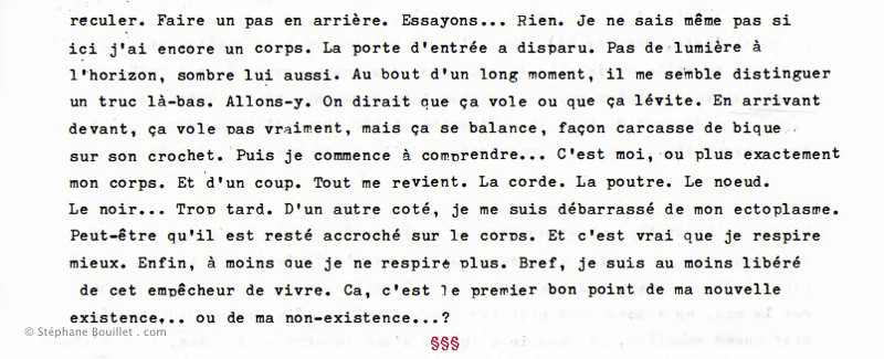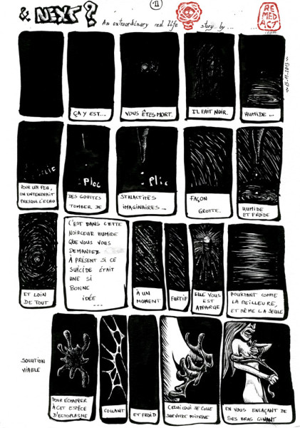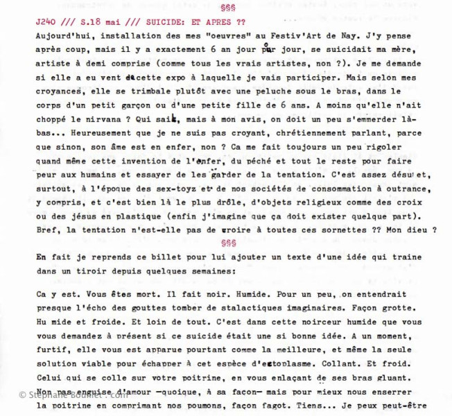 Aujourd'hui, installation des mes "oeuvres" au Festiv'Art de Nay. J'y pense après coup, mais il y a exactement 6 ans jour pour jour, se suicidait ma mère, artiste à demi comprise (comme tous les vrais artistes, non ?). Je me demande si elle a eu vent de cette expo à laquelle je vais participer. Mais selon mes croyances, elle se trimbale plutôt avec une peluche sous le bras, dans le corps d'un petit garçon ou d'une petite fille de 6 ans. A moins qu'elle n'ait choppé le nirvana ? Qui sait, mais à mon avis, on doit un peu s'emmerder là-bas... Heureusement que je ne suis pas croyant, chrétiennement parlant, parce que sinon, son âme est en enfer, non ? Ca me fait toujours un peu rigoler quand même cette invention de l'enfer, du péché et tout le reste pour faire peur aux humains et essayer de les garder de la tentation. C'est assez désuet, surtout, à l'époque des sex-toyz et de nos sociétés de consommation à outrance, y compris, et c'est bien là le plus drôle, d'objets religieux comme des croix ou des jésus en plastique (enfin j'imagine que ça doit exister quelque part). Bref, la tentation n'est-elle pas de croire à toutes ces sornettes ?? Mon dieu ? En fait je reprends ce billet pour lui ajouter un texte d'une idée qui traine dans un tiroir depuis quelques semaines: Ça y est. Vous êtes mort. Il fait noir. Humide. Pour un peu, on entendrait presque l'écho des gouttes tomber de stalactiques imaginaires. Façon grotte. Humide et froide. Et loin de tout. C'est dans cette noirceur humide que vous vous demandez à présent si ce suicide était une si bonne idée. À un moment, furtif, elle vous est apparue pourtant comme la meilleure, et même la seule solution viable pour échapper à cet espèce d'ectoplasme. Collant. Et froid. Celui qui se colle sur votre poitrine, en vous enlaçant de ses bras gluants. Non pas en guise d'amour -quoique, à sa façon- mais pour mieux nous enserrer la poitrine en comprimant nos poumons, façon fagot. Tiens... Je