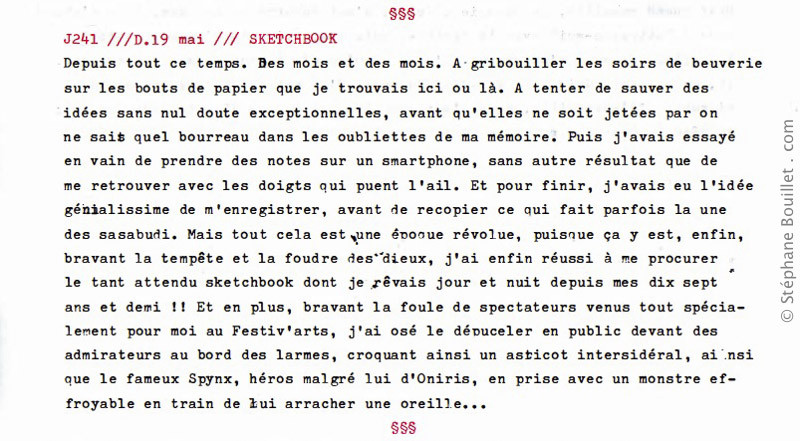 TEXTE : Depuis tout ce temps. Des mois et des mois. A gribouiller les soirs de beuverie sur les bouts de papier que je trouvais ici ou là. A tenter de sauver des idées sans nul doute exceptionnelles, avant qu'elles ne soient jetées par on ne sait quel bourreau dans les oubliettes de ma mémoire. Puis j'avais essayé en vain de prendre des notes sur un smartphone, sans autre résultat que de me retrouver avec les doigts qui puent l'ail. Et pour finir, j'avais eu l'idée génialissime de m'enregistrer, avant de recopier ce qui fait parfois la une des sasabudi. Mais tout cela est, une époque révolue, puisque ça y est, enfin, bravant la tempête et la foudre des dieux, j'ai enfin réussi à me procurer le tant attendu sketchbook dont je rêvais jour et nuit depuis mes dix sept ans et demi !! Et en plus, bravant la foule de spectateurs venus tout spécialement pour moi au Festiv'arts, j'ai osé le dépuceler en public devant des admirateurs au bord des larmes, croquant ainsi un asticot intersidéral, ainsi que le fameux Spynx, héros malgré lui d'Oniris, en prise avec un monstre effroyable en train de lui arracher une oreille...