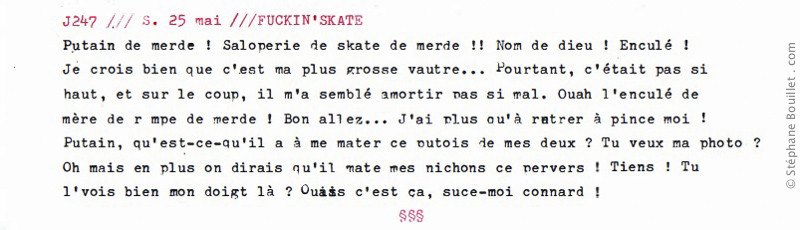 Putain de merde ! Saloperie de skate de merde !! Nom de dieu ! Enculé ! Je crois bien que c'e'st ma plus grosse vautre... Pourtant, c'était pas si haut, et sur le coup, il m'a semblé amortir pas si mal. Ouah l'enculé de sa mère de rampe de merde ! Bon allez... J'ai plus qu'à rentrer à pince moi ! Putain, qu'est-ce-qu'il a à me mater ce putois de mes deux ? Tu veux ma photo ? Oh mais en plus on dirait qu'il mate mes nichons ce pervers ! Tiens ! Tu l'vois bien mon doigt là ? Ouais c'est ca, suce-moi connard !
