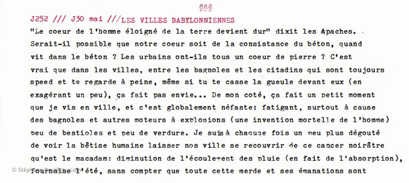 TEXTE : "Le cœur de l'homme éloigné de la terre devient dur" dixit les Apaches. Serait-il possible que notre cœur soit de la consistance du béton, quand on vit dans le béton ? Les urbains ont-ils tous un cœur de pierre ? C'est vrai que dans les villes, entre les bagnoles et les citadins qui sont toujours speed et te regarde à peine, même si tu te casses la gueule devant eux (en exagérant un peu), ça fait pas envie... De mon coté, ça fait un petit moment que je vis en ville, et c'est globalement néfaste: fatigant, surtout à cause des bagnoles et autres moteurs à explosions (une invention mortelle de l'homme) peu de bestioles et peu de verdure. Je suis à chaque fois un peu plus dégoûté de voir la bêtise humaine laisser nos villes se recouvrir de ce cancer noirâtre qu'est le macadam: diminution de l'écoulement des pluies (en fait de l'absorption), fournaise l'été, sans compter que toute cette merde et ses émanations sont sans doute toxiques et cancérigènes pour l'homme et toutes autres créatures. Parfois je vois un arbre entouré de ce pus noir, et là, c'est sûr que l'on est en plein dans l'éloignement de la terre, et de la nature en même temps. Ça me fait penser d'ailleurs à toutes ces mégalopoles, qui concentrent toutes sans exception les vices humains, mais très peu les vertus. Pourquoi ? Mais tout simplement parce qu'elles sont invivables ! Elles sont "contre-nature".