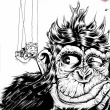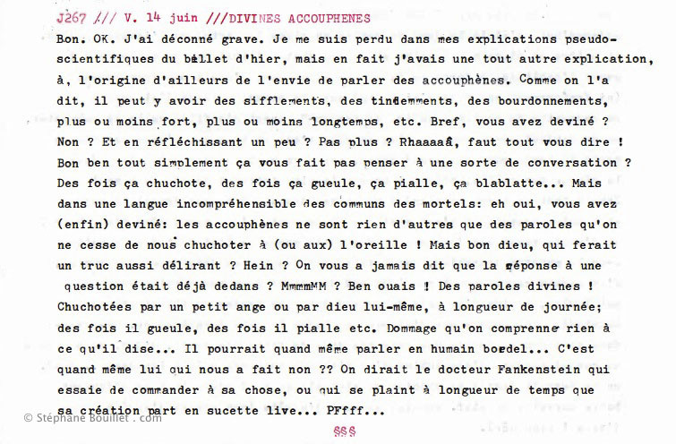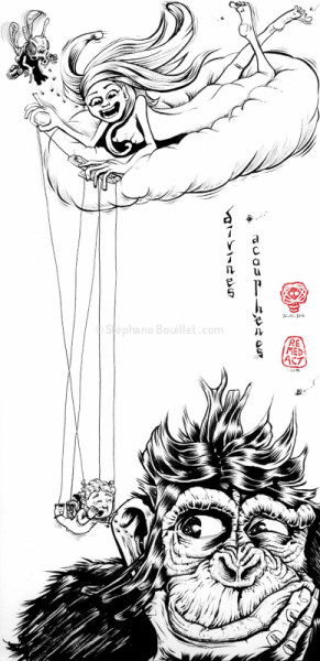 ILLUSTRATION : Dieu femme tire les ficelles d'un angelot chuchotant des acouphènes à un chimpanzé, bientôt homme. Dieu reçoit elle-même des chuchotements de la part d'une espèce extra-terrestre TEXTE : Bon. OK. J'ai déconné grave. Je me suis perdu dans mes explications pseudoscientifiques du billet d'hier, mais en fait j'avais une tout autre explication, à l'origine d'ailleurs de l'envie de parler des acouphènes. Comme on l'a dit, il peut y avoir des sifflements, des tintements, des bourdonnements, plus ou moins forts, plus ou moins longtemps, etc. Bref, vous avez deviné ? Non ? Et en réfléchissant un peu ? Pas plus ? Rhaaaaâ, faut tout vous dire ! Bon ben tout simplement ça vous fait pas penser à une sorte de conversation ? Des fois ça chuchote, des fois ça gueule, ça piaille, ça blablate... Mais dans une langue incompréhensible des communs des mortels: eh oui, vous avez (enfin) deviné: les acouphènes ne sont rien d'autres que des paroles qu'on ne cesse de nous chuchoter à (ou aux) l'oreille ! Mais bon dieu, qui ferait un truc aussi délirant ? Hein ? On vous a jamais dit que la réponse à une question était déjà dedans ? MmmmMM ? Ben ouais ! Des paroles divines ! Chuchotées par un petit ange ou par dieu lui-même, à longueur de journée; des fois il gueule, des fois il piaille etc. Dommage qu'on comprenne rien à ce qu'il dise... Il pourrait quand même parler en humain bordel... C'est quand même lui qui nous a fait non ?? On dirait le docteur Frankenstein qui essaie de commander à sa chose, ou qui se plaint à longueur de temps que sa création part en sucette live... PFfff...
