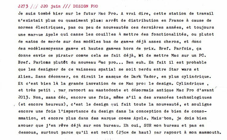 TEXTE : Je suis tombé hier sur le futur Mac Pro. À vrai dire, cette station de travail n'existait plus ou quasiment plus: arrêt de distribution en France à cause de normes électriques, pas ou peu de nouveautés ces dernières années, et toujours une marque Apple qui casse les couilles à mettre des fonctionnalités, ou plutôt de matos de merde sur des modèles bas de gamme déjà assez cheros, et donc des modèles moyenne gamme et hautes gammes hors de prix. Bref. Parfois, ça donne envie de pirater comme cela se fait déjà, et de mettre Mac sur un PC. Bref. Parlons plutôt du nouveau Mac pro... Ben euh. En fait il est probable que les designer de ce vaisseau spatial se soit perdu entre Star wars et Alien. Sans déconner, on dirait le casque de Dark Vador, en plus cylindrique. Et c'est bien là la grande innovation de ce Mac pro: le design. Cylindrique, et très petit , par rapport au mastodonte et désormais antique Mac Pro d'avant 2013. Non, sans déc, encore une fois, même s'il a des avancées technologiques (et encore heureux), c'est le design qui fait toute la nouveauté, et souligne encore une fois l'importance du design dans la conception de biens de consommation, et encore plus dans des marques comme Apple. Mais bon, je dois bien avouer que j'en rêve déjà sur mon bureau. Eh oui, SUR mon bureau et pas en dessous, surtout parce qu'il est petit (25cm de haut) par rapport à mon mammouth.