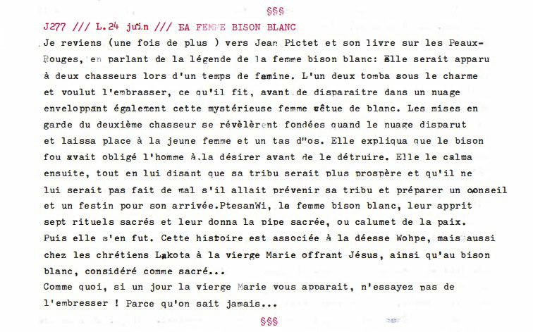 Je reviens (une fois de plus ) vers Jean Pictet et son livre sur les Peaux-Rouges, en parlant de la légende de la femme bison blanc: elle serait apparue à deux chasseurs lors d'un temps de famine. L'un deux tomba sous le charme et voulut l'embrasser, ce qu'il fit, avant de disparaître dans un nuage enveloppant également cette mystérieuse femme vêtue de blanc. Les mises en garde du deuxième chasseur se révélèrent fondées quand le nuage disparut et laissa place à la jeune femme et un tas d'os. Elle expliqua que le bison fou avait obligé l'homme à la désirer avant de le détruire. Elle le calma ensuite, tout en lui disant que sa tribu serait plus prospère et qu'il ne lui serait pas fait de mal s'il allait prévenir sa tribu et préparer un conseil et un festin pour son arrivée. PtesanWi, le femme bison blanc, leur apprit sept rituels sacrés et leur donna la pipe sacrée, ou calumet de la paix. Puis elle s'en fut. Cette histoire est associée à la déesse Wohpe, mais aussi chez les chrétiens Lakota à la vierge Marie offrant Jésus, ainsi qu'au bison blanc, considéré comme sacré... Comme quoi, si un jour la vierge Marie vous apparaît, n'essayez pas de l’embrasser ! Parce qu'on sait jamais...