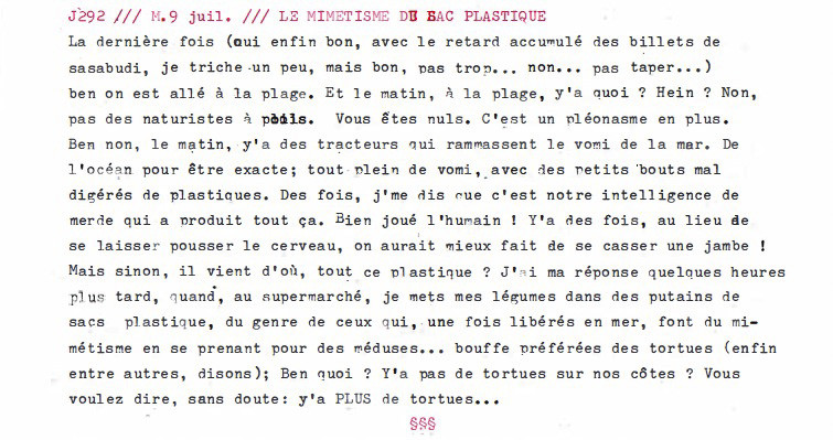 La dernière fois (oui enfin bon, avec le retard accumulé des billets de sasabudi, je triche un peu, mais bon, pas trop... non... pas taper...) ben on est allé à la plage. Et le matin, à la plage, y'a quoi ? Hein ? Non, pas des naturistes à poils. Vous êtes nuls. C'est un pléonasme en plus. Ben non, le matin, y'a des tracteurs qui ramassent le vomi de la mer. De l'océan pour être exact; tout-plein de vomi, avec des petits bouts mal digérés de plastiques. Des fois, j'me dis que c'est notre intelligence de merde qui a produit tout ça. Bien joué l'humain ! Y'a des fois, au lieu de se laisser pousser le cerveau, on aurait mieux fait de se casser une jambe ! Mais sinon, il vient d'où, tout ce plastique ? J'ai ma réponse quelques heures plus tard, quand, au supermarché, je mets mes légumes dans des putains de sac plastique, du genre de ceux qui, une fois libérés en mer, font du mimétisme en se prenant pour des méduses... bouffe préférées des tortues (enfin entre autres, disons). Ben quoi ? Y'a pas de tortues sur nos côtes ? Vous voulez dire, sans doute: y'a PLUS de tortues...