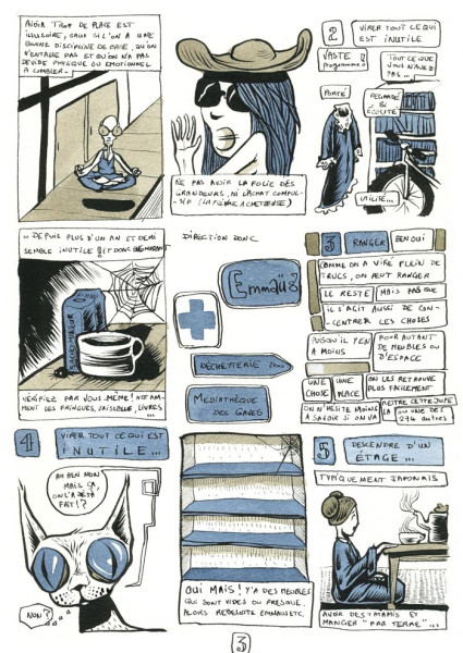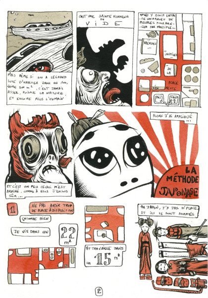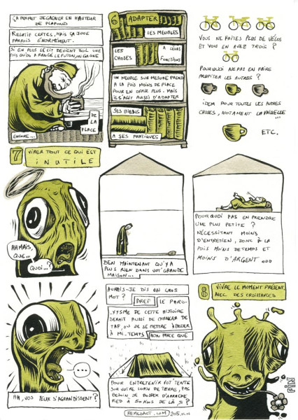 BD sur l'espace de vie et sa décroissance On rêve souvent de grands espaces, alors que la réalité est là: on est confinés comme des cons dans un 30 m2, parfois moins, et un peu plus pour d'autres. En tous les cas souvent entassés comme des sardines les uns sur les autres. Pas étonnant qu'on soit stressés comme des anchois sans choix. Et quand on veut s'en échapper, c'est souvent pour se mettre dans un espace encore plus petit: la bagnole. Après quoi on s'étonne d'engueuler comme du poisson pourri ce connard de mollusque que se limace devant nous. Mais même si on a le grand luxe d'habiter dans un 100, voire 200 m2, c'est jamais assez, puisque la nature et encore plus l'humain, ont horreur du vide. Après y avoir entassé un paquet de meubles pour ranger nos multiples merdes inutiles, de la place, il n'en reste pas tant ! Et c'est un peu ce qui m'était arrivé, comme à vous j'en suis sûr. Alors j'ai appliqué la méthode japonaise... 1. Ne pas avoir trop de place à disposition. Ça tombe bien, je vis dans un 22 m2, et travaille dans un 15 m2. Au Japon, y'a pas de place, et ils se sont adaptés. Avoir trop de place est illusoire, sauf si l'on a une bonne discipline de base, qu'on n'entasse pas, et qu'on n'a pas de vide (physique ou émotionnel à combler). Ne pas avoir la folie des grandeurs, ni l'achat compulsif (la fièvre acheteuse) 2. Virer tout ce qui est inutile. Vaste programme ! On peut le voir de divers points de vue: tout ce que vous n'avez pas porté, utilisé, regardé, visionné, écouté depuis 1 an et 1/2 semble inutile, et donc encombrant. Vérifier par vous-même. Notamment pour les fringues, la vaisselle, les livres etc. Direction donc Emmaus, la Croix Rouge, la déchetterie, les médiathèque etc. 3. Ranger. Ben oui, comme on a viré plein de trucs, on peut ranger le reste. Mais pas que. Il s'agit aussi de concentrer les choses, puisqu’il y en a moins pour autant de meubles ou d'espace. Une chose. Une place. On les retrouve plus f