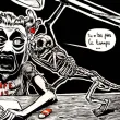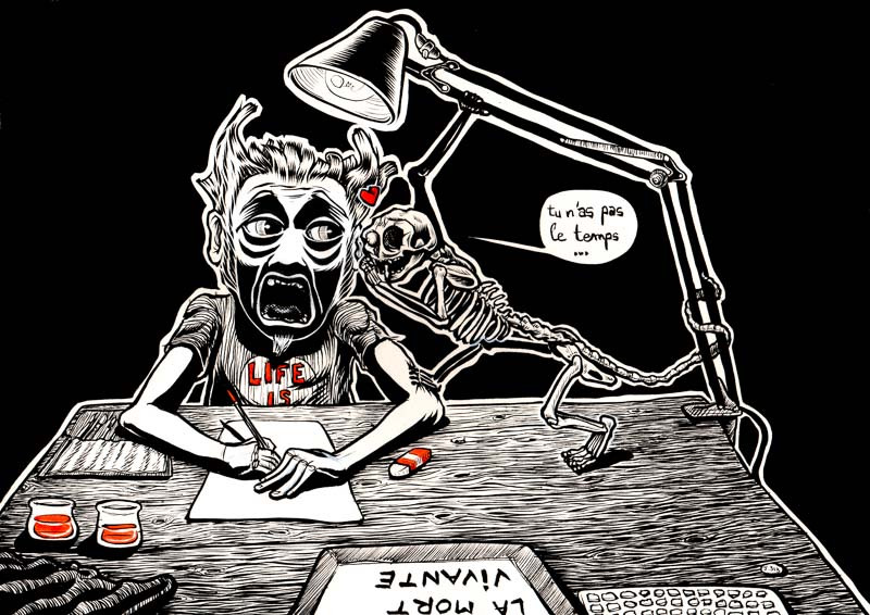 légende : un chat squelette parle à un dessinateur sur sa table à dessin et lui chuchote "tu n'as pas le temps
