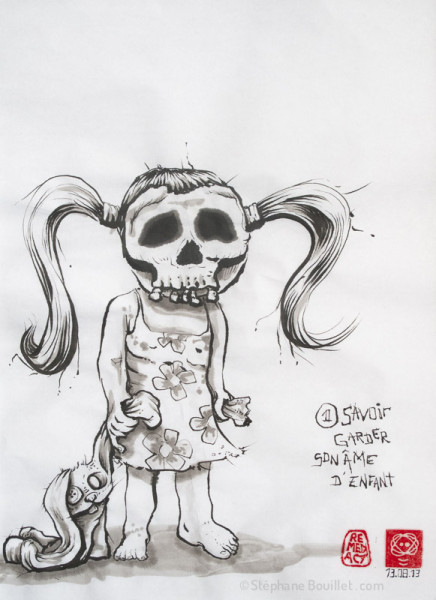 ILLUSTRATION : Une petite fille avec un masque en forme de crâne tien son doudou (un lapin en peluche) d'une main et un billet de 10 euros de l'autre