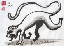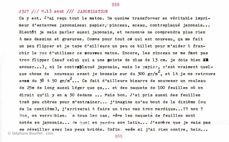 TEXTE : Ça y est. J'ai reçu tout le matos. De quoi me transformer en véritable imprimeur d'estampes japonaises: papier, pinceaux, sceau, contreplaqué japonais... Bientôt je vais parler aussi japonais, et personne ne comprendra plus rien à mes dessins et gravures. Comme pour tout ce qui est nouveau, ça me fait un peu flipper et je tape d'ailleurs un peu ce billet pour m'aider à franchir le pas d'utiliser ce nouveau matos. Encore, les pinceaux ne me font pas trop flipper (sauf celui qui a une pointe de plus de 13 cm, je dois bien avouer... ), ni le contreplaqué japonais, mais le papier, c'est vraiment quelque chose de nouveau: avant je bossais sur du 300 gr/m2, et là je me retrouve avec du 38 à 50 gr/m2... Ça fait d'ailleurs bizarre de soupeser un rouleau de 25m de long aussi léger que ça... et des paquets de 100 feuilles où l'on dirait qu'il y en a 30 dedans... Mais bon. J'ai pris aussi des feuilles très peu chères pour m’entraîner... j'imagine qu'au bout de la dixième (ou de la centième), j'arriverai à faire un truc pas trop merdique... ? ? non ? Bon, on verra bien.