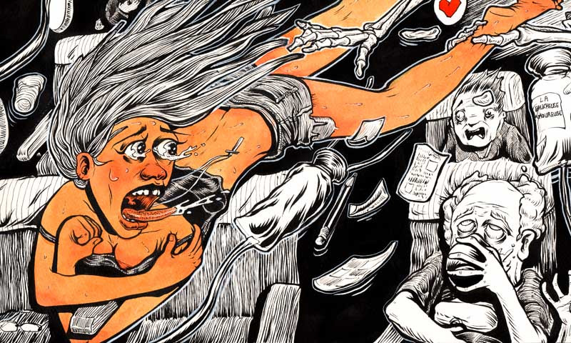 C'était le bordel intégral. Je ne crois pas nue vous puissiez une seconde vous imaginer ce que cela puisse être. La preuve: vous êtes encore vivant. Tout volait ou virevoltait autour de moi. Je agrippais à mon siège comme une araignée à sa toile quand on passe l'aspirateur. Et c'est bien de ça qu'il s'agissait: comme un gigantesque aspirateur qui nous aspirait comme des vulgaires moustiques, mais qui ne volaient plus. Et c'est bien de ça qu'il s'agissait: on ne volait plus. L'avion ne volait plus, et perdait ses entrailles dont nous faisions partie, comme de vulgaires asticots. C'est là, alors que voyais encore quelques énergumènes, la bouche grande ouverte, mais dont aucun sons ne semblaient sortir, que je l'ai senti. Sa main, remontant le long de ma jambe, puis de ma cuisse, alors que son autre main me maintenait la cheville. Elles étaient froides, c'est tout ce dont je me souvienne, et rugueuses... comme la mort. Car c'est bien de ça qu'il s'agissait: la mort aurait voulu que je lâche mon accoudoir, et que je me laisse aspirer par le néant, là, dehors. Ce qui est marrant, enfin , si l'on peut dire, c'est que je n'entendait plus rien: les hurlements, l'aspiration, et même cette espèce de faucheuse qui semblait me parler, et articuler avec insistance les mêmes mots "I love U". C'est tout ce dont je me rappelle...