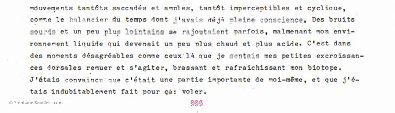 J'entendais comme des tambours au rythme plus ou moins régulier. Je me demandais s'ils tapaient dans ma tête ou en dehors, mais j'aurais plutôt dit en dehors, car en moi semblait battre un tambour bien plus petit et plus rapide. Enfin de toute façon tout cela ne signifiait rien pour moi, et n'avait pas d'autre importance que de me bercer, et de déclencher des mouvements tantôt saccadés et amples, tantôt imperceptibles et cycliques, comme le balancier du temps dont j'avais déjà pleine conscience. Des bruits sourds et un peu plus lointains se rajoutaient parfois, malmenant mon environnement liquide qui devenait un peu plus chaud et plus acide. C'est dans des moments désagréables comme ceux-là que je sentais mes petites excroissances dorsales remuer et s'agiter, brassant et rafraîchissant mon biotope. J'étais convaincu que c 'était une partie importante de moi-même, et que j'étais indubitablement fait pour ça: voler.