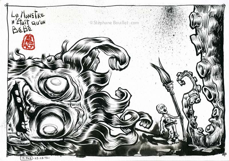 Moins de trois semaines. Trois petites semaines. C'est le temps qui reste avant la mise à mort du projet sasabudi. Enfin en théorie, car le connaissant, il va à la fois réussir à se débattre et me glisser entre les bras, comme une anguille gluante. C'est que, même au soir du 21 septembre, je crois que je n'en n'aurai pas tout à fait fini avec ce projet. Du retard, pour commencer, à rattraper, comme des dizaines de bébés anguilles à rattraper une par une. De l'imprévu, aussi, puisque je n'ai commencé les illustration qu'au J077... Vais-je rattraper aussi les 77 premiers jours ? C'est ce que je pensais au début, mais finalement je ne crois pas. Déjà les textes ne doivent pas trop coller, enfin, même si je peux toujours finir par trouver une idée d'illustration, mais c'est surtout que je suis déjà ailleurs, à penser à d'autres projets, autre chose que ce qui est devenu une sorte de routine. On dirait que je fais déjà la rubrique nécro du sasabudi, et c'est pour ainsi dire presque ça: j'y ai pris et appris plein de trucs, mais j'ai besoin et envie d'aller voir ailleurs, et pas que en Chine ou au Japon. Oui: je dois tuer le sasabudi, avant qu'il ne me tue, m'écrasant sous son poids, vampirisant mes dernière minutes de journée, de soirée ou de nuit, s'invitant dans mes rêves ou cauchemars, squattant mes week-end et jours fériés, effaçant mes possibilités ou envies de vacances... Mon dieu, dit comme ça, je crois bien qu'on peut dire l’indicible: j'ai mis au monde un monstre ! Quelle horreur, et, à la fois , les progrès qu'il m'aura fallu faire pour le combattre et le vaincre, auront sans aucun doute été bénéfiques, me permettant alors d'envisager de m'attaquer à un autre monstre ou une multitude de petits monstrouilles, globalement encore plus gros, plus visqueux, plus sournois, plus imposant etc etc... en un mot : plus monstrueux...
