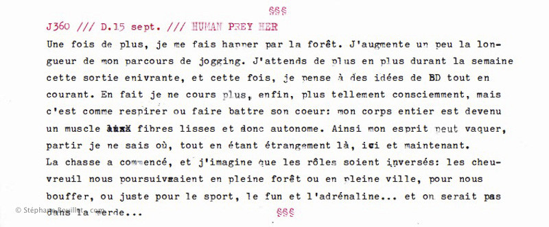Une fois de plus, je me fais happer par la forêt. J'augmente un peu la longueur de mon parcours de jogging. J'attends de plus en plus durant la semaine cette sortie enivrante, et cette fois, je pense à des idées de BD tout en courant. En fait je ne cours plus, enfin, plus tellement consciemment, mais c'est comme respirer ou faire battre son cœur: mon corps entier est devenu un muscle aux fibres lisses et donc, autonome. Ainsi mon esprit peut vaquer, partir je ne sais où, tout en étant étrangement là, ici et maintenant. La période de chasse a commencé, et j'imagine que les rôles soient inversés: les chevreuils nous poursuivraient en pleine forêt ou en pleine ville, pour nous bouffer, ou juste pour le sport, le fun et l'adrénaline... et on serait pas dans la merde...