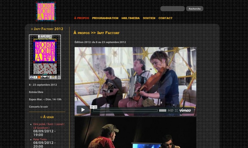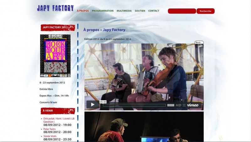 Conception, mise en place et design (suivant une charte graphique) du site internet de l'association Japy Factory, pour la promotion artistique (exposition, concert...) à Beaucourt, dans le Territoire de Belfort (90).