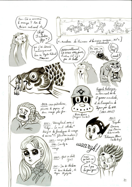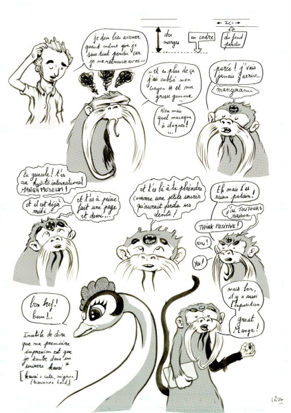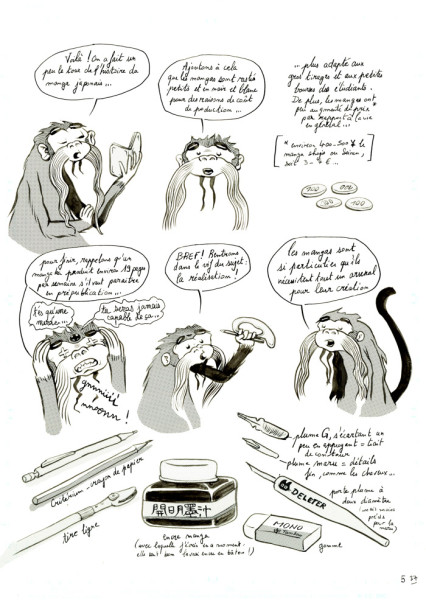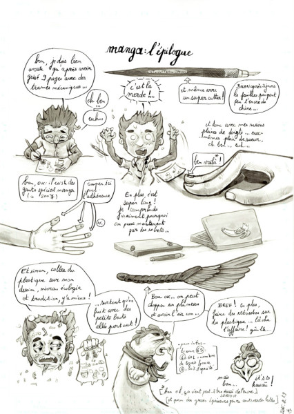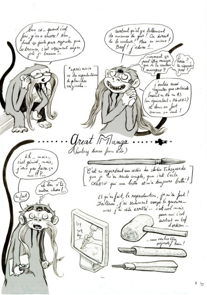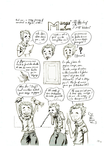 Visite du Manga Museum: historique du manga, outils spécifiques au manga, essai des feuilles margée bleues, des trames... puis retour au lavis. Questionnement sur l'estampe et le coté créatif et artisanal de ce travail, les outils spécifiques à la gravure sur bois...