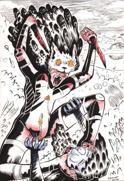 Une femme indigène attaque un homme bleu en pleine forêt, avec deux pieux. Elle porte un masque de chat dont les yeux ont été remplacés par des étoiles.