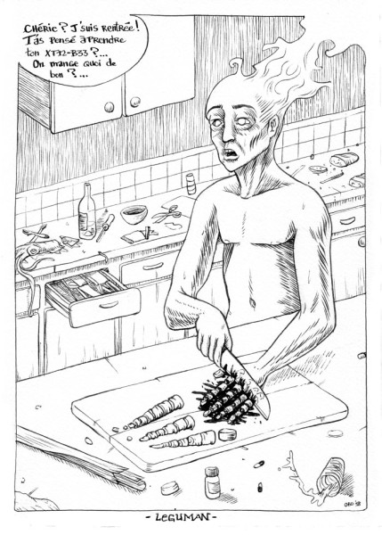 Avec sa bulle de bande dessinée, il mélange aussi efficacement illustration et BD. Il a été long à accoucher et a demandé plusieurs essais (plumes diverses, pinceau, ligne claire ou sombre…).