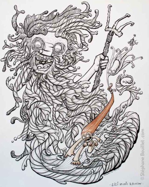Lili la zombie surfe sur la barbe du dieu des mers Poséidon, armé de son trident. Sa barbe est comme une vague qui se détache en gouttelettes d'eau. Lili est une femme nue, ayant juste son chapelet comme bracelet de cheville et son tatouage de cœur sur le sein. Un poulpe est accroché dans ses cheveux et entraîné dans sa course folle, tenant lui-même un poisson dans ses tentacules, qui en a perdu la mouche qu'il venait de gober.