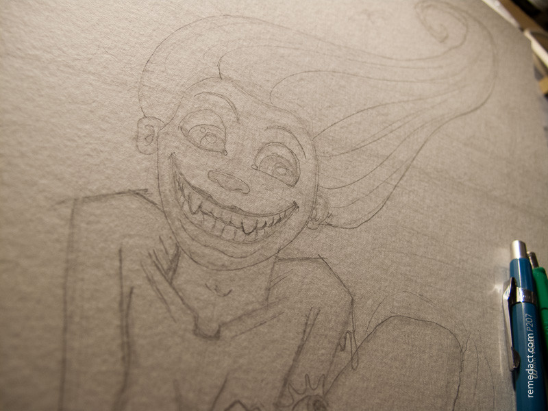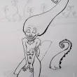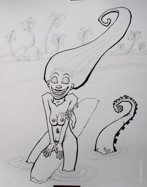 Lili est assise sur une planche de surf, dans la mer, dans un spot de rêve avec palmier et case. Un bébé seiche est ventousé à son bras, alors que maman seiche sort de l'eau un tentacule de pieuvre géante. Lili est nue, portant seulement son tatouage de coeur sur le sein, et son piercing.