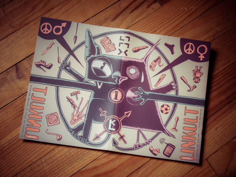 Couverture du fanzine Linkult#1, spécial relation homme / femme. Cette couverture reprend les deux mascottes du fanzine Mao le chat et Q.I. le canari, en leur associant des objet typiquement masculins ou féminins. Linkult est un fanzine développé par et pour des jeunes du Haut-Béarn: Oloron Sainte Marie et ses vallées alentour. Illustration + mise en couleur + mise en page par Stéphane Bouillet (Remedact)