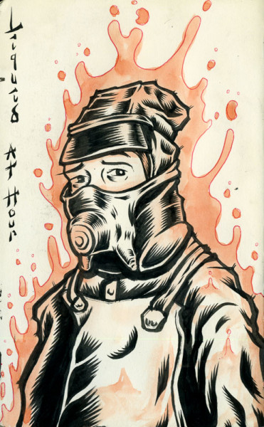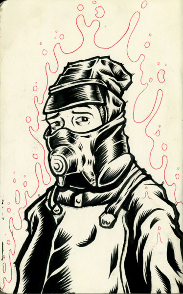 Portrait de liquidateur portant un masque à gaz et des protections sur le visage ainsi qu'un tablier de plomb, d'après une photo d'époque