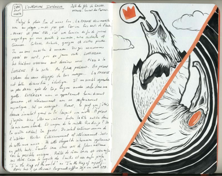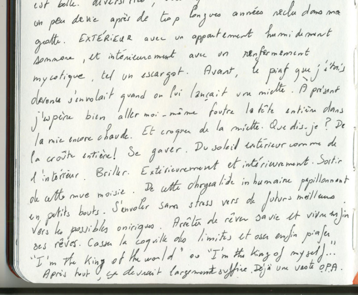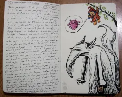 Sketchbook analytique. Association de textes et de dessins les illustrant. ± 1 texte et 1 dessin par jour Ou comment noircir le papier pour blanchir son âme, jeter mots et maux pour s'alléger le cœur, le corps, la tête et l'esprit. NB: ni le texte ni les dessins n'ont vocation à être des chefs-d'œuvre ou des prouesses techniques ou lyriques. C'est juste une méthode de progression.