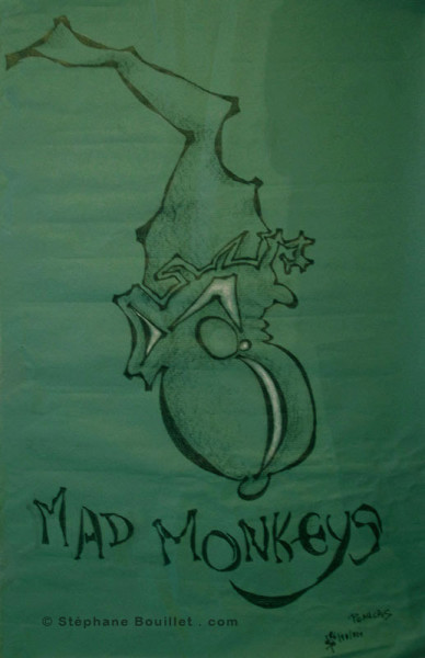 Sur la base de la vache folle, crée de toute pièce par les humains et leur bêtise, une illustration d'un singe fou, avec un entonnoir sur la tête...