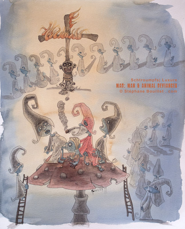 Les Schtroumpfs n'ont d'autres occupations que de se faire tripoter (ou de tripoter) la seule Schtroumpfette disponible. Ils succombent tous à la luxure, en plus d'un racisme primaire envers les Schtroumpfs noirs. Cette illustration est basée sur une photo du Ku Klux Klan dans sa période faste. Le grand Schtroumpf, comme sur la photo, est à cheval... sur la Schtroumpfette.