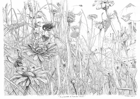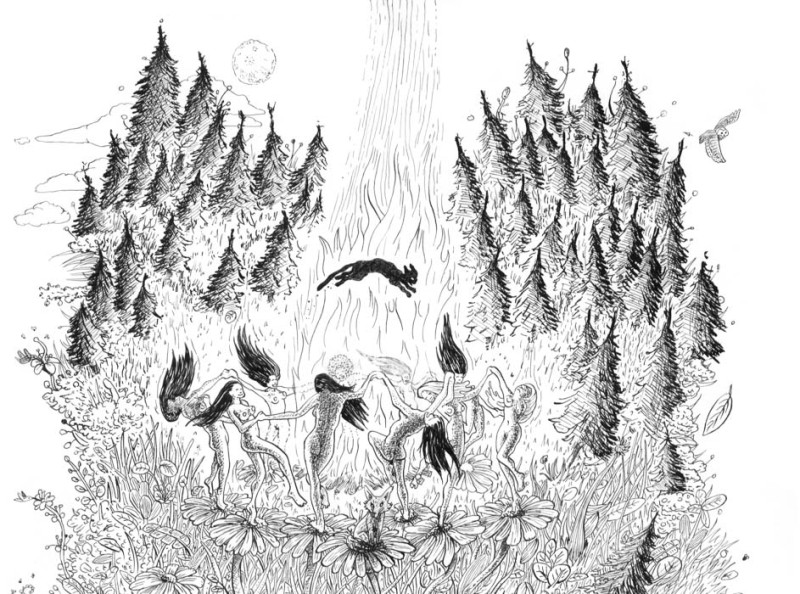 L'une d'elles s'est transformée en chat noir qui saute au dessus du feu. Il y a également d'autres animaux comme un paresseux, une chouette, un renard posé sur une marguerite, deux colibris.