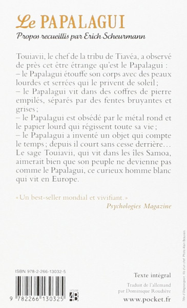 Point de vue simple et très visionnaire du sage Touiavii (vivant dans les îles Samoa), sur le Papalagui, ce curieux homme blanc qui vit en Europe, et qui a développé de nombreuses maladies et comportements absurdes... Vrai et vraiment excellent ! tellement simple...