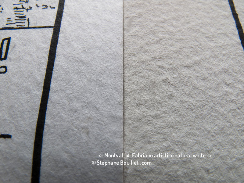 - Montval: 100% cellulose, c'est-à-dire du bois ! Il est corrigible à l'aquarelle, puisqu'il a une surface plus lisse (etc): on peut enlever une partie de l'aquarelle même après séchage. Intérêt pour le débutant mais inutile pour le confirmé. Naturellement très blanc.