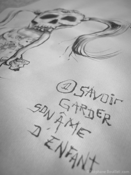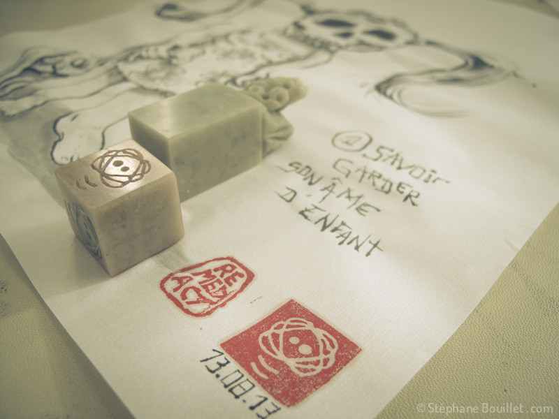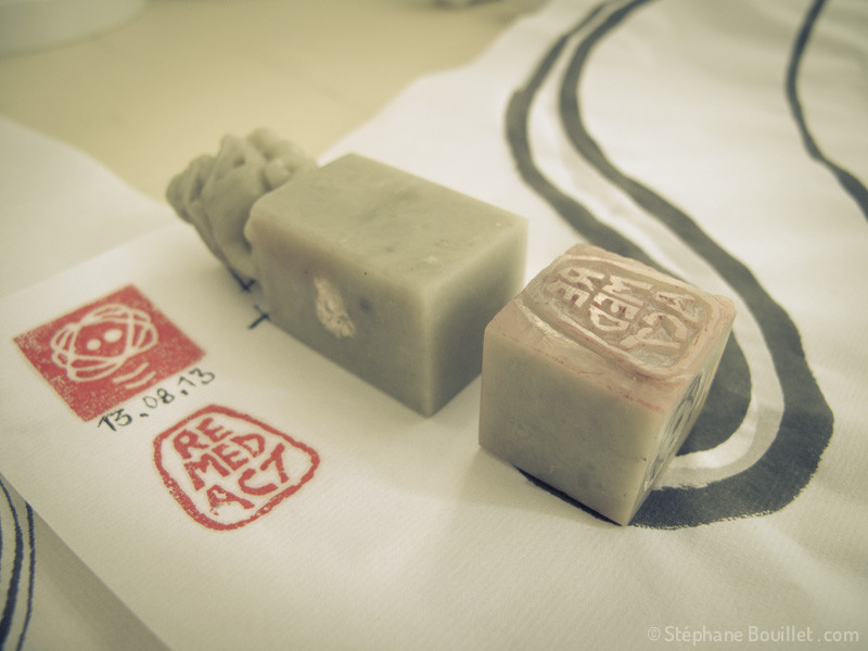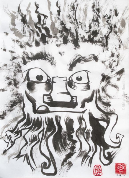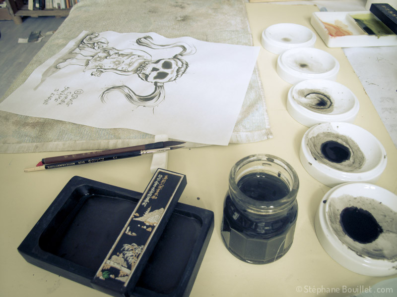 - Une fois terminée, la dernière étape consiste à signer l’œuvre. Traditionnellement avec un petit texte en chinois ou japonais et le sceau de votre nom. Pour ce qui est du texte, même si la calligraphie chinoise et japonaise sont une partie importante de l’œuvre, je ne vais personnellement pas me prendre la tête avec ça, parce le spectateur non initié perd la compréhension du texte et que l'on peut aussi bien calligraphier du texte français ou anglais. Et puis, j'aime bien m'inspirer de techniques, mais en les intégrant, en les digérant, en les faisant miennes.