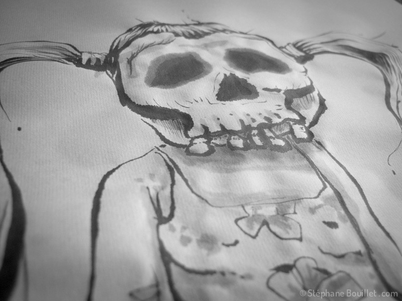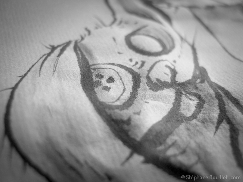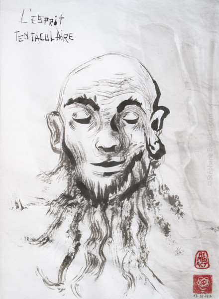 - peindre: là c'est votre style qui va dicter et faire voyager votre pinceau, mais gardez à l'esprit trois particularités: d'une part, on tient le pinceau assez verticalement, mais on peut appliquer avec le pinceau divers types de touches: touches pleines (verticales, noires), des touches étalées (mouvement latéral d'un pinceau penché: un coté bien noire et précis, un coté un peu dilué), des touches en pointillées (cf le sol de La méditation du panda) et des touches en volutes (poser + tourner sur lui-même un pinceau assez sec / cf barbe de L'esprit tentaculaire). D'autre part, on peut appliquer l'encre sur un papier sec ou mouillé, de même que l'on peut ajouter de l'eau (rapidement) pour diluer les bords d'un trait. Enfin, on peut diluer l'encre de Chine afin de faire autant de nuances de gris que l'on souhaite, et là, c'est vrai que les godets en porcelaine, ou la marguerite, sont tout simplement géniaux.
