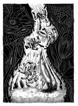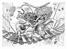 Cette double page m'a pris beaucoup de temps : nombreux personnages, variants au fur et à mesure du transit, visions chamaniques dignes d'hallucinations sous ayahuasca etc.