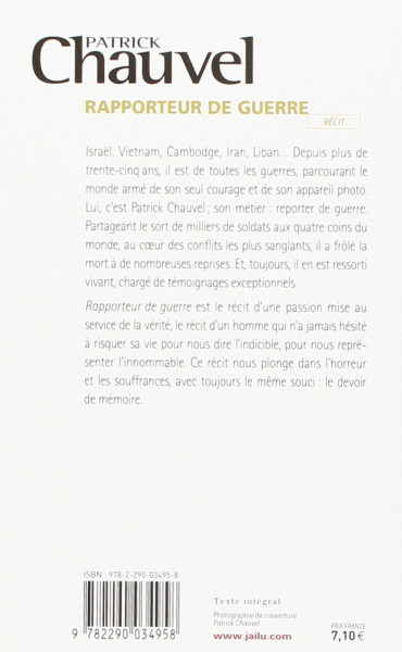 Depuis trente-cinq ans, Patrick Chauvel a photographié la majeure partie des conflits qui ont sévi dans le monde. Nourri par Kessel, Monfreid et Schoendoerffer, les grands anciens, fils du grand reporter Jean-François Chauvel, il a tenté d'aller encore plus près de l'actualité. Il est l'un des derniers d'une génération de reporters qui a vécu dans la guerre des Six Jours, le Viêtnam, le Cambodge, l'Irlande, l'Iran, le Liban, Panama, l'Afghanistan, la Tchétchénie... Il aurait dû mourir cent fois, il a été blessé à de nombreuses reprises. Au cours de ses reportages, Patrick Chauvel a été enlevé, il s'est retrouvé face à un peloton d'exécution, il a coulé avec les boat people à Haïti...
