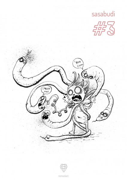 Ce n° 3 contient les premières dessins illustrant spécifiquement les textes de Sasabudi. Quand j’ai fait ce choix, je n’imaginais pas dans quel engrenage je venais de mettre le doigt, ni l’ampleur qu’allait prendre le projet avec cette nouvelle étape d’illustration du texte tapé à la machine à écrire... Demandez l'programme !