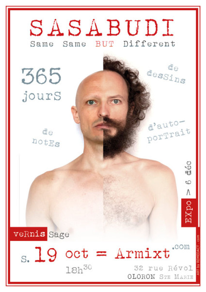 Sasabudi, c'est la concentration de Same Same But Different, projet sur 1 an, avec chaque jour: un autoportrait (en laissant pousser barbe et cheveux) + un texte (tapé sur une vieille machine à écrire Olympia De Luxe) + une illustration du texte.