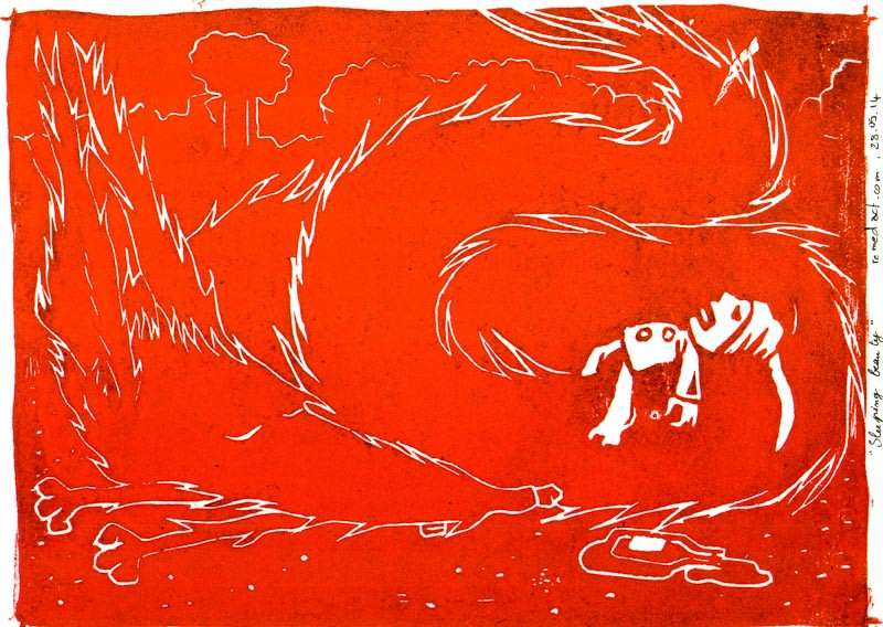 Par S. BOUILLET, 20 octobre, 2014 Publié dans Gravure Créé avec Linogravure Encre à l'eau A5 (±15 x 20 cm) Papier Fabriano (300g/m2) Le petit chaperon rouge est endormi sur la queue du loup Voir plus de Conte Le grand méchant loup Le petit chaperon rouge Sommeil Forêt