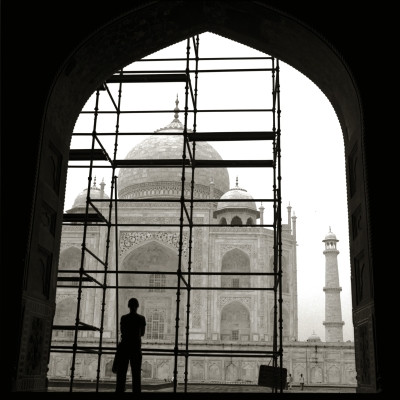 Après avoir lâché 750 Rs, soit plus de 37 fois le tarif indien :(, y'a plus qu'à se jeter dans la gueule du loup de ce Taj Mahal Bah, c'est vrai, c'est assez joli et grandiose, pas de souci. Mais est-ce beau ? Je veux dire, passé le superficiel, passé le premier coup d'oeil ? Primo c'est un tombeau, ou en tous les cas, ça l'est devenu. Cela explique sûrement le fait qu'il fasse si sombre à l'intérieur... ce qui est quand même dommage pour un tel bâtiment, blanc qui plus est ! D'ailleurs la photo est interdite a l'intérieur, d'où sans doute l'histoire du trépied... Normalement on se ballade pieds-nus, mais des touristes se baladent avec des espèces de charlottes ou sur-boot, ce qui donne à la fois l'air con, spationaute ou police scientifique... sans parler du surcoût pour la planète... Dommage. Pollueurs-payeurs, j'espère au moins qu'ils ont payé...