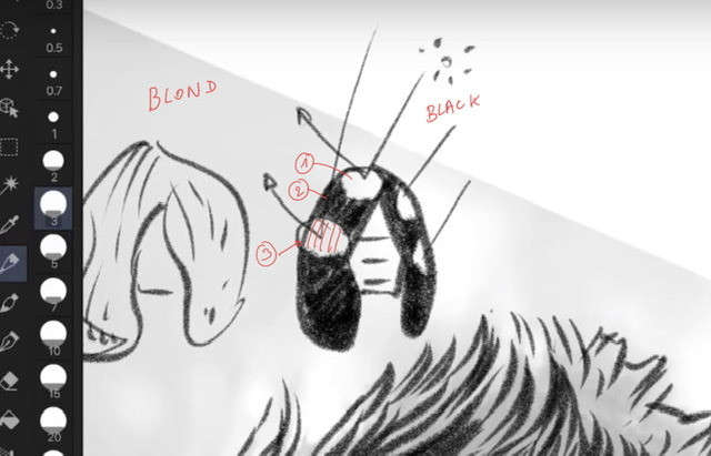 - TIPS : vos cheveux sont blonds ? Faites le moins de traits possible. S'ils sont noirs, placez les reflets, remplissez les aplats de noirs, puis ajoutez les langues de gris