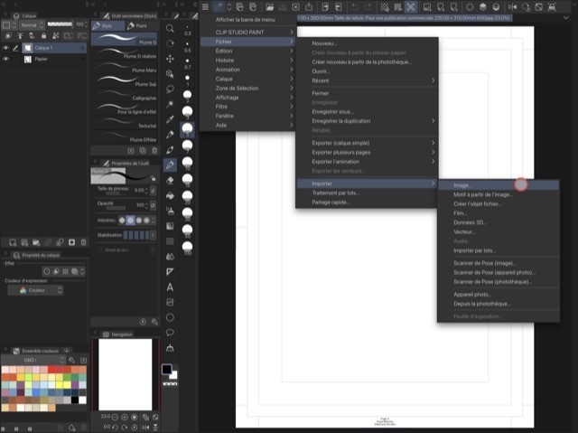 - Importez-le dans Clip Studio Paint par le [menu] > [Fichier] > [Importer] > [Image] (ou [photothèque] etc) et régler la taille de l'image