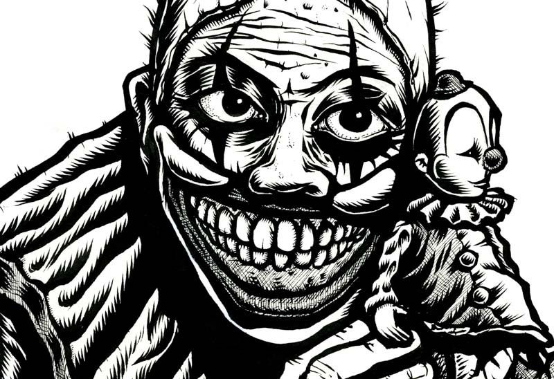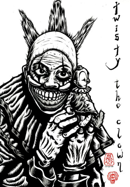 Twisty le clown (le Clown tortueux), personnage de la quatrième raison de la série American Horror Story (AHS - Freak show), tient un petit clown dans ses mains. Il porte un masque arborant un large sourire et un scalp Twisty le clown, joué par John Carroll Lynche est l'antagoniste principal de la saison. Il est exaspéré par l'arrivée de l'exposition de monstres. Il porte un masque sur la partie inférieure de son visage parce... Selon le directeur Ryan Murphy, Lynchez est si terrifiant dans ce personnage que la moitié du temps, presque un tiers de l'ensemble de l'équipe quitte les lieux quand ils tournent ses scènes parce qu'ils ont peur de lui.