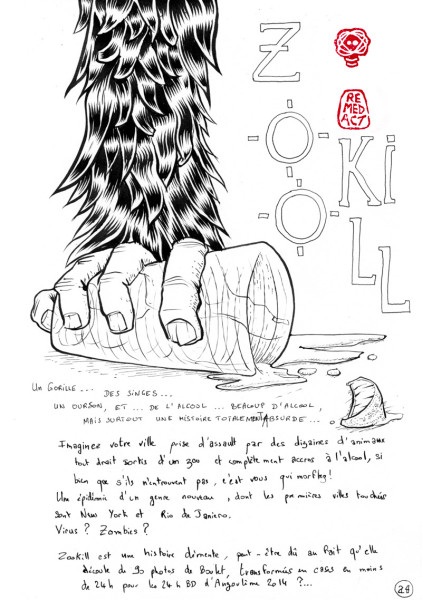 ZooKill - 24hBD d'Angoulème 2014 Imaginez votre ville prise d'assaut par des animaux sortis d'un zoo et complètement accros à l'alcool, si bien que s'ils n'en trouvent pas, c'est vous qui morflez. Une épidémie d'un genre nouveau dont les premières villes touchées sont New York et Rio de Janiero. Virus ? Zombies ?? ZooKill est une histoire complètement démente, peut-être dû au fait qu'elle découle de 90 photos de Boulet, transformées en cases en moins de 24h pour les 24h BD d'Angoulême 2014...